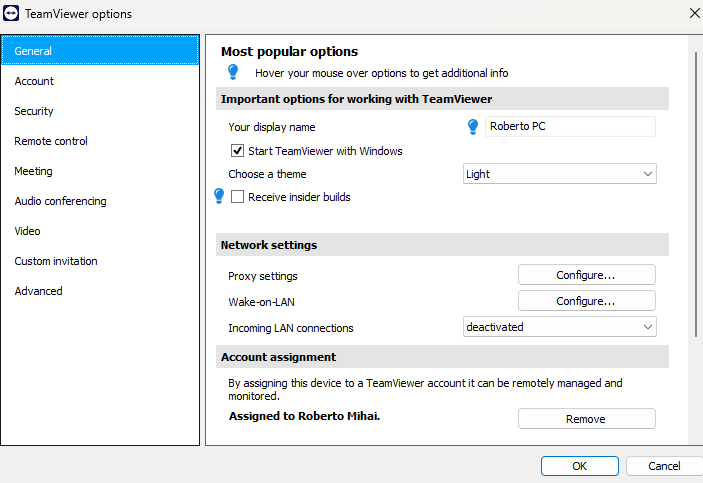 Here's a picture of the only setting I found even remotely related.. "Start TeamViewer with Windows: on or off"
