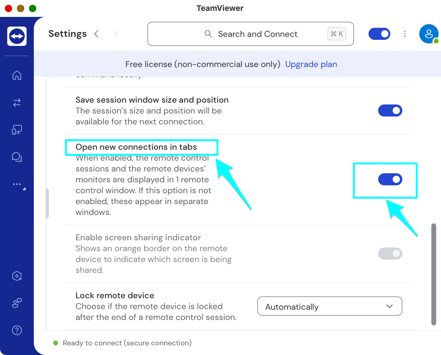 I am using TeamViewer on my Mac to connect to my girlfriend's Windows computers (she has two: Her original computer and har dad's computer that she inherited). When I open the connections to those computers, I want their desktops to automatically appear as two tabs in the same window, rather than two different windows. I can do this by selecting "View → Show Sessions in Tabs" after I open the connections, but I'd rather have it do this automatically without having to select "View → Show Sessions in Tabs" every single time.