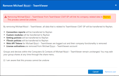 from web Management Console i can Delete an user (I act as administrator in a TeamViewer company profile). During deletion, I'm warned that past account's consumptions will be re-assigned to the connected operator (me). This is at least what I remember from the last delete operation (a lot of months ago).