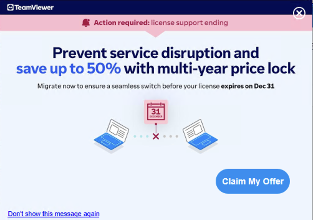 We strongly encourage all users of versions 11 and 12 to consider upgrading to the latest version of TeamViewer. As a valued member of our community, you are eligible for an exclusive upgrade discount when transitioning to a subscription plan.