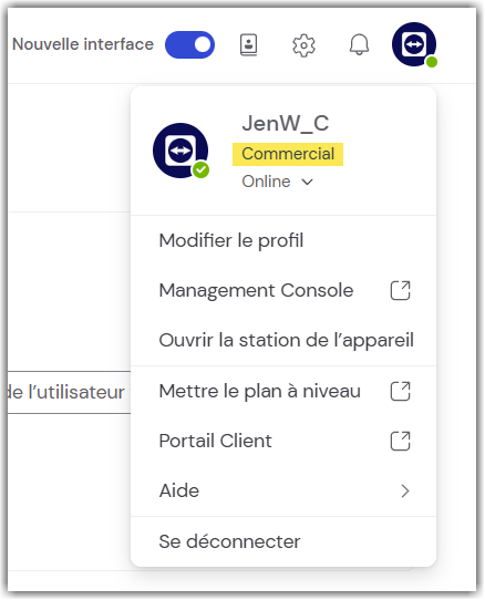 Vous devriez voir la mention Commercial en cliquant sur votre photo de profil, dans le coin supérieur droit de l'interface :
