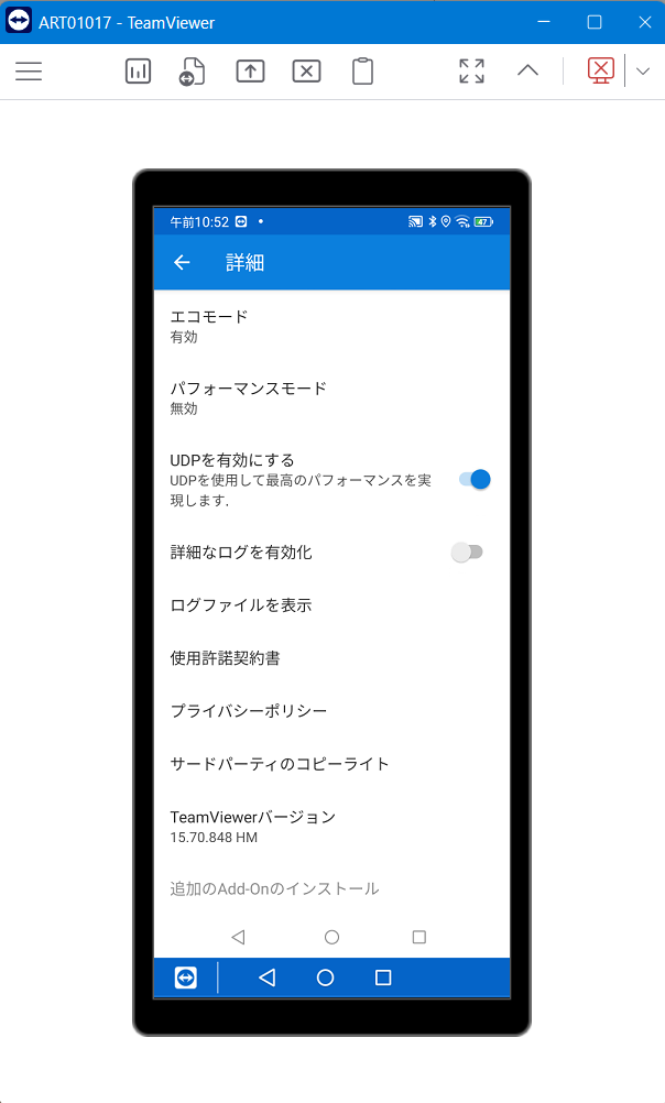 スマートフォンは機種は JetfonS20i, OS は Android9 で、TeamViewer のバージョンは以下です。