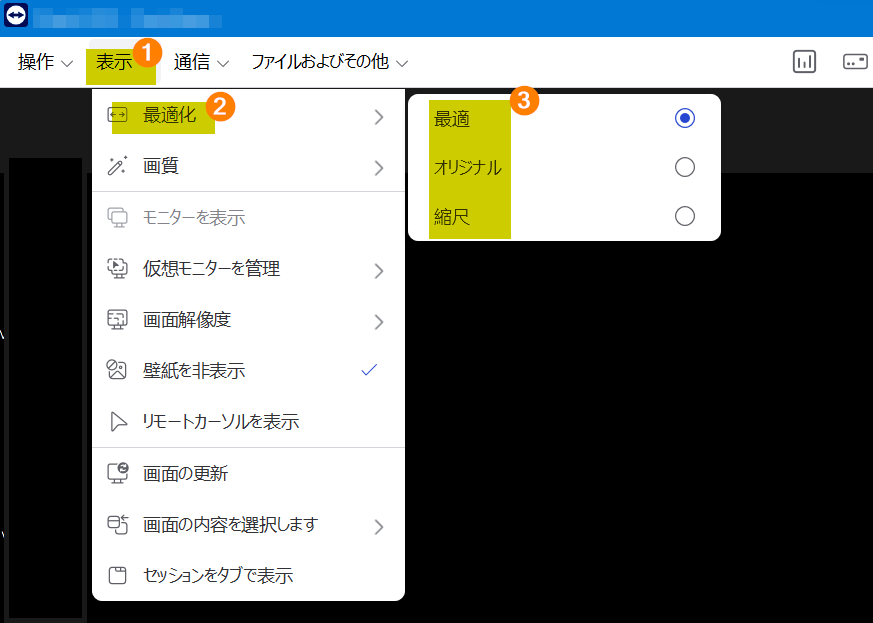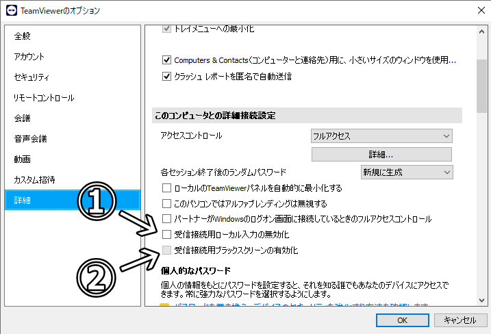 ※ ↓ ①と②にチェックボックスを入れるとリモート側の画面は常時ブラックスクリーンになる、という私の認識です。