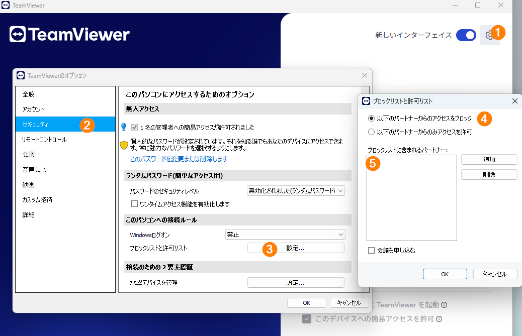 表示されているエラーメッセージは非常に限定的な内容であるため、やはりブロックリストや許可リストの設定が接続を妨げている可能性が高いと考えられます。 すでにご確認いただいているとのことですが、念のため、接続先の端末にて以下の手順に従い、再度ご確認いただけますでしょうか。 添付のスクリーンショットに記載された番号順に操作いただき、手順5の「ブロックリスト」に、ユーザー様のTeamViewer IDやアカウントのメールアドレスが含まれていないことをご確認ください。