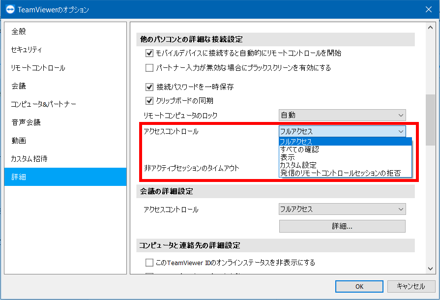 フルアクセス、すべての確認、表示、カスタム設定、または発信のリモートコントロールセッション拒否から選択します。